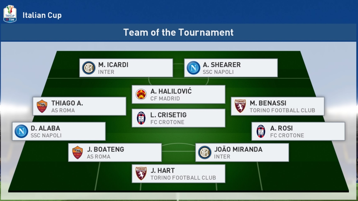 Halilović znalazł się w jedenastce tegorocznej edycji Coppa Italia. Osobiście poczynaniami młodego Chorwata w tym sezonie zachwycony jednak nie jestem. Zdecydowanie zbyt rzadko błyszczał on umiejętnościami, dostosowując się poziomem do marazmu wielu swoich kolegów z boiska. Liczba goli i asyst na poziomie tej Simone Pepe to w przypadku gracza z ponad 85 OVR zdecydowanie za mało. Równie źle w minionych miesiącach wypadli moi ofensywni pomocnicy. O ile jeszcze Roga może tłumaczyć proces adaptacji po przyjściu zimą za Arcasa, o tyle Casteldine po prostu zawiódł. Na tej pozycji piłkarz nie może nie mieć po 38. kolejkach nawet jednego gola i asysty, jako jeden z niewielu w całej kadrze. To już nawet defensywny pomocnik Cozarri wpisał się na listę strzelców i zanotował jedno kluczowe podanie, choć jego zadaniem było głównie rozbijanie ataków przeciwników. Czeka nas poważna rozmowa. W gruncie rzeczy zadowolony mogę być tylko z defensywy – Ferrini znakomicie dowodzi formacją, a Kalaica, Stankovich, Marchizza i Prodl tworzyli bardzo dobrze ustawiającą się i rozbijającą ataki grupę. Gdyby tylko w ofensywie wyglądało to równie dobrze.