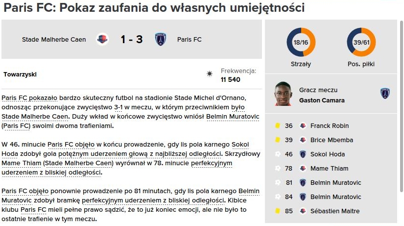 Pomimo braku rezerwowych skrzydłowych, którzy mogliby odciążyć Dembele i Camarę, Paris FC wypadło solidnie także w sparingu z drugoligowym Caen, swoim klubem filialnym. Wynik 3:1 był zaskakująco dobrym rezultatem na tym etapie przygotowań. Ryzykowne ustawienie z tylko jednym nominalnym środkowym pomocnikiem znowu zdało egzamin, a moja bardzo ofensywna taktyka przyniosła kolejny triumf.