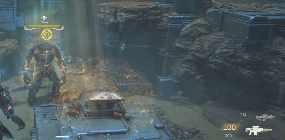 Aż trudno było uwierzyć, że zamknięta skrzynia pośrodku jaskini nikogo wcześniej nie zainteresowała. Freelancer nie miał czasu się nad tym zastanawiać, bo archiwista w uchu pospieszał go, by jak najszybciej otworzył wieko. Kiedy tylko wylądował obok artefaktu, z wnętrza skrzyni buchnął ogień, a powietrze napełniło się drżeniem Hymnu. Z płomieni obok wyłonił się Tytan, a jego ciało pulsowało żarem ze szczelin w korpusie. „Kontakt!” – wrzasnął archiwista przez komunikator, choć freelancer nie potrzebował ostrzeżeń. Tytan już walił pięścią w ziemię, a eksplozja ognia rozrzuciła kamienie i pył, rozsyłając po raz pierwszy niszczącą falę po jaskini.