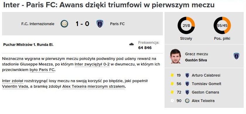 W następnych minutach rozpisałem plan taktyczny, w którym założeniem był frontalny atak na Inter i pójście na wymianę ciosów. Nawet jeśli polegniemy, to raz jeszcze zapiszemy się w pamięci kibiców, jako ekipa, która tworzy przepiękne widowiska. Niech zatęsknią za Paris FC, gdy już odpadniemy. Piłkarzom przedstawiłem to oczywiście nieco inaczej, co by nie wyjść na tracącego kontakt z rzeczywistością szaleńca. Słowem kluczem dla nich były gole na wyjeździe.
