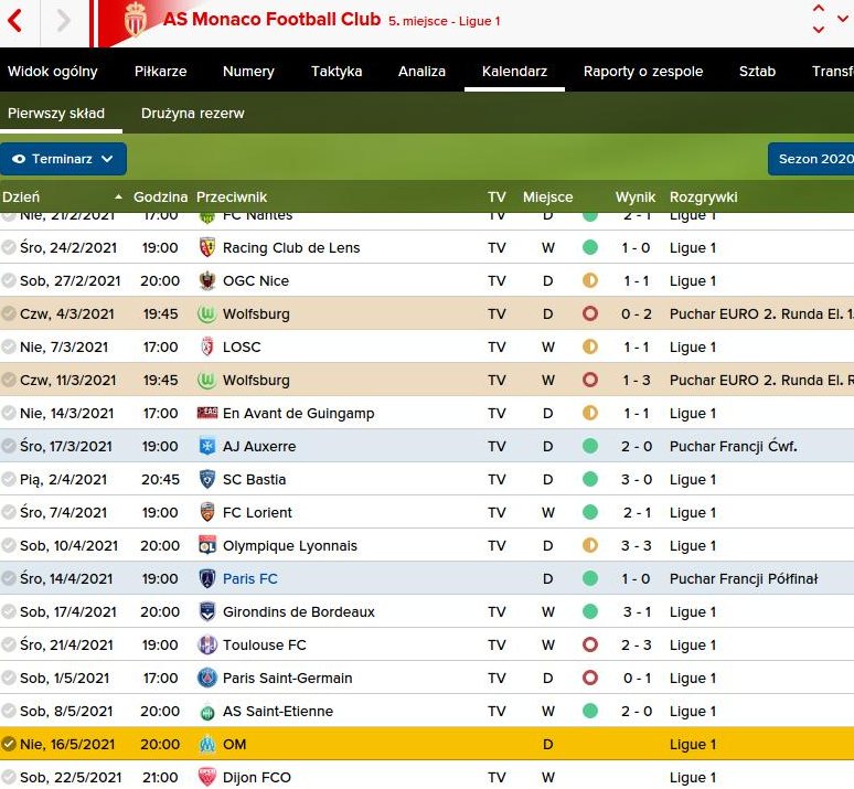 Sezon kończymy z Ajaccio i Bastią, a więc przeciwnikami z dolnych rejonów tabeli – zaczął. Nie będzie jednak nam z tego powodu łatwo, bo wciąż biją się oni o utrzymanie, więc na pewno wyjdą na murawę porządnie zmotywowani – dodał. Ale pamiętajmy, że ich forma jest daleka od optymalnej. Korsykańczycy przegrali pięć poprzednich spotkań w Ligue 1 – wtrącił szef skautingu. Pokiwałem ze zrozumieniem głową i poprosiłem o status na temat terminarza oponentów.