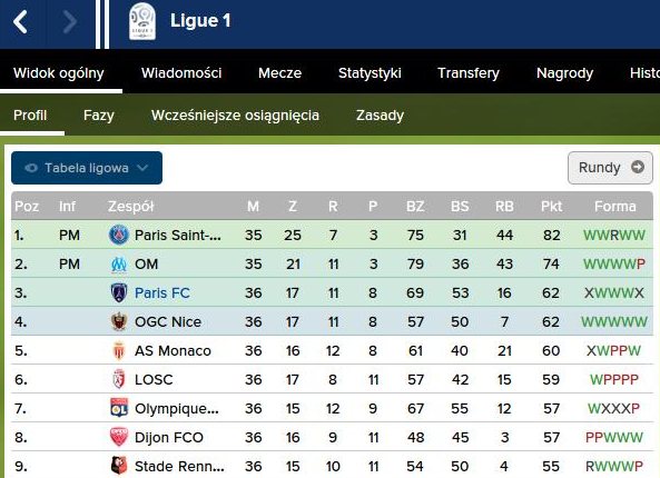 Po 36. kolejkach na pole position stali Nicea i Paris FC. Obie jedenastki uzbierały 62 punkty. Dwa oczka mniej miało na swoim koncie piąte Monaco, trzy traciło pogrążone w kryzysie Lille, a tylko teoretyczne szanse na podium zachowywali gracze Lyonu, ze swoimi 57 punktami. Dobra Panowie, to jak to wygląda? Wszystko tak naprawdę w naszych rękach, bo to my możemy roztrwonić teraz przewagę i dać się wyprzedzić przed finiszem – rzuciłem do grzebiących w papierach i laptopach współpracowników. Asystent skończył podpinać notebooka do projektora i chwilę później rozpoczął wyświetlanie slajdów.