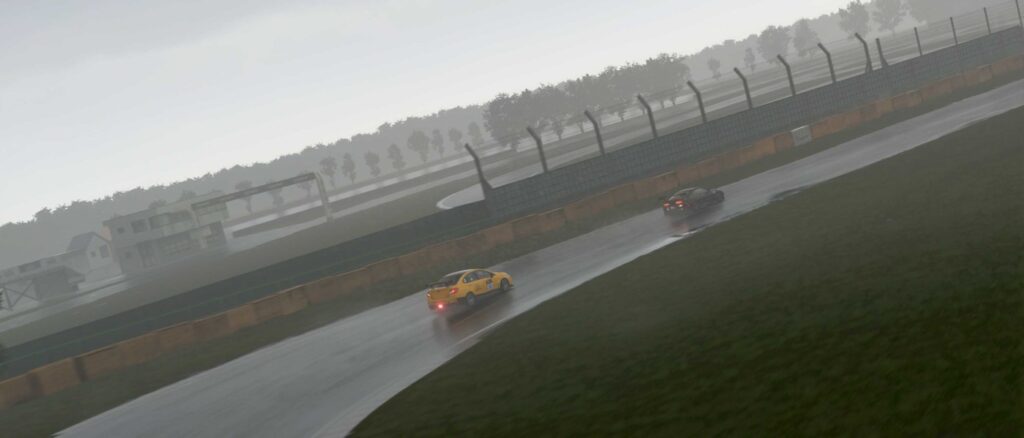 Około trzynastego okrążenia jest już naprawdę mokro. Sportowe opony dogorywają, zwłaszcza przednia lewa. Zjeżdżam jako trzynasty w stawce… i daję się zaskoczyć. Okazuje się, że w tym wyzwaniu można korzystać tylko ze sportowych opon. Nie ma zmiany na deszczówki. Jest konieczność utrzymania tańczącej maszyny na pełnym kałuży torze.